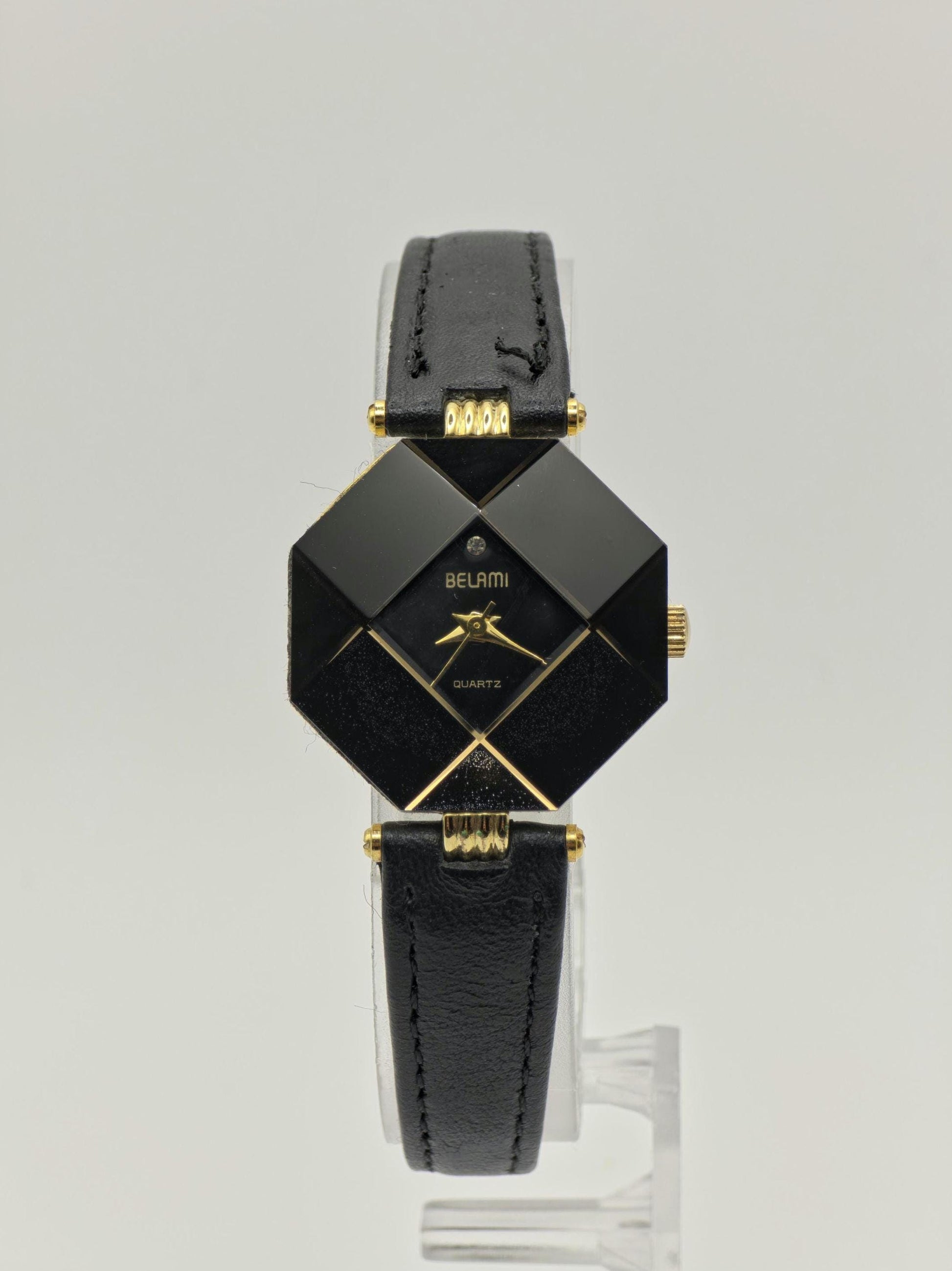A unique and eye-catching Belami BA-587L women's wristwatch featuring a distinctive geometric black dial, elegant gold-tone accents, and a classic black leather strap.