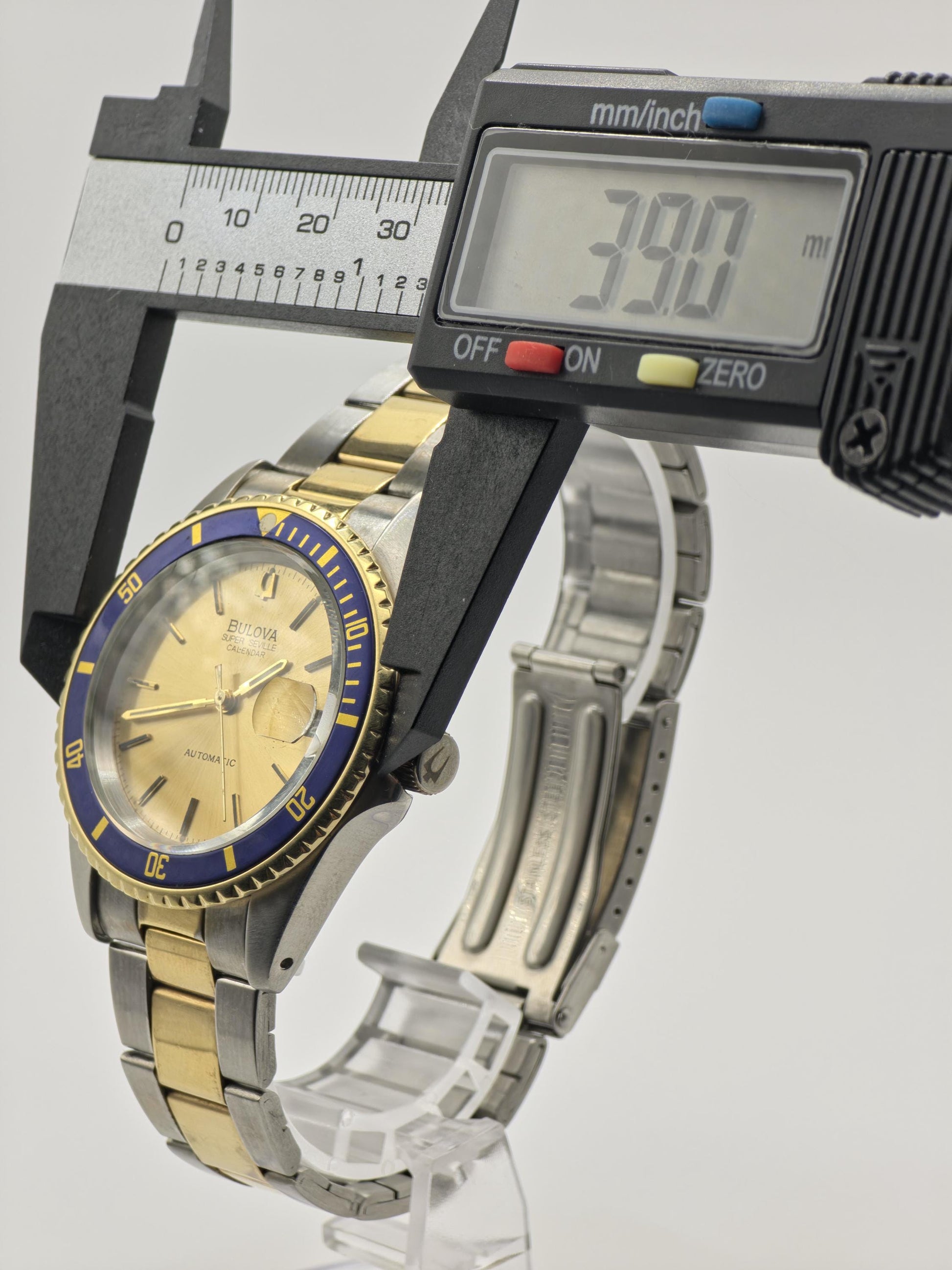 A classic vintage Bulova Super Seville Calendar men's wristwatch featuring a stainless steel and gold-tone (two-tone) case and bracelet, paired with a gold dial and a blue rotating bezel.
